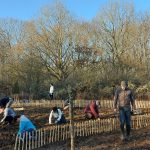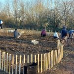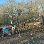 Plantation d'une haie fruitière en bordure du chemin, paillage et pose de clôture basse.