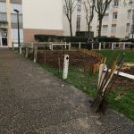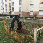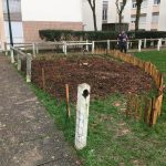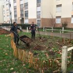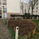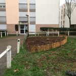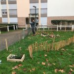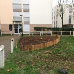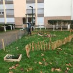 Plantation d'un espace de vivaces aromatiques pour les habitants. La mise en place d'une petite clôture basse en ganivelle de châtaignier nous a semblé indispensable pour éviter la présence des chiens sur ce spot.